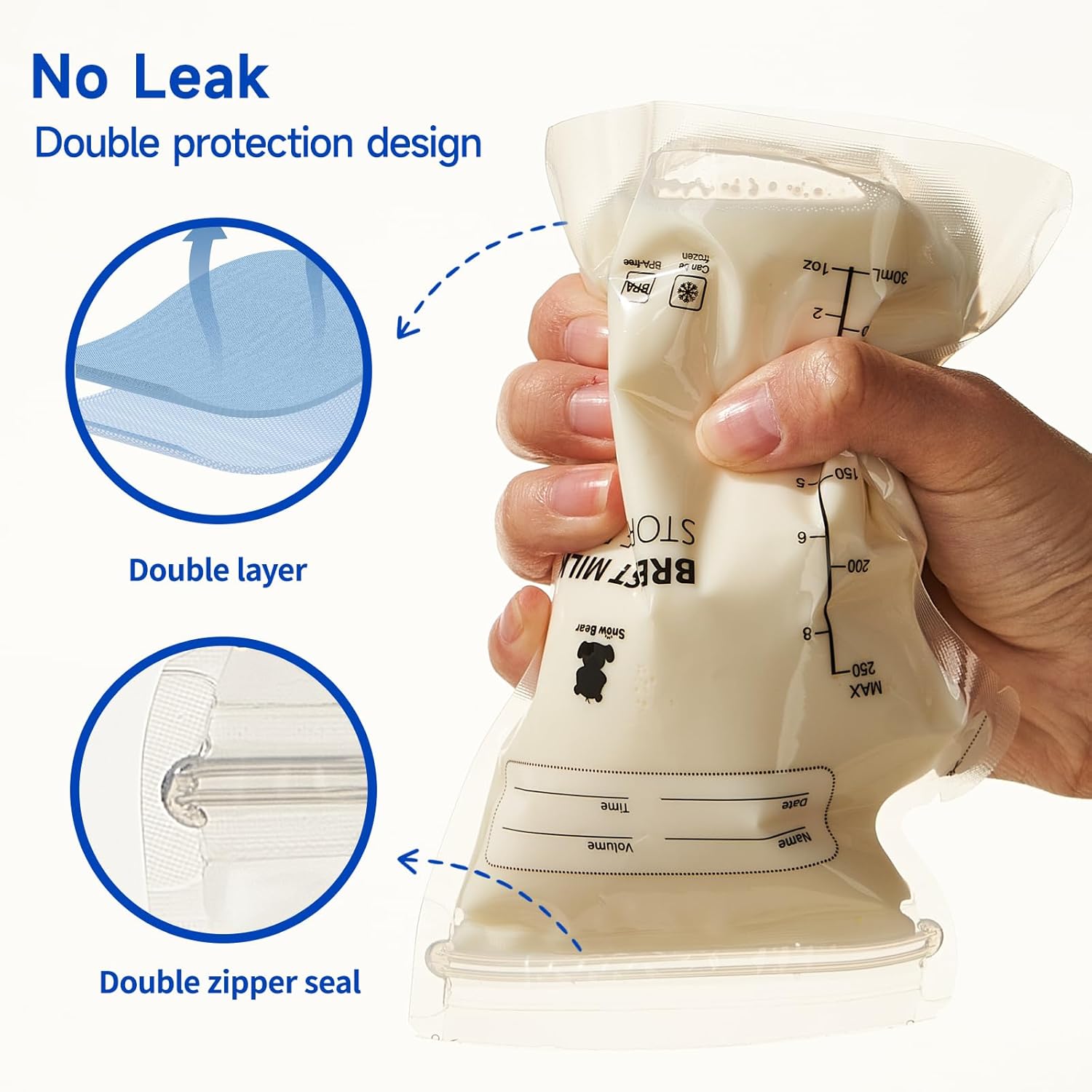 - No Leakage: Snow Bear milk storage bags are made of strong double-layer material. The double zipper seal and extra side thickened seal design prevents breastmilk bags from leaking