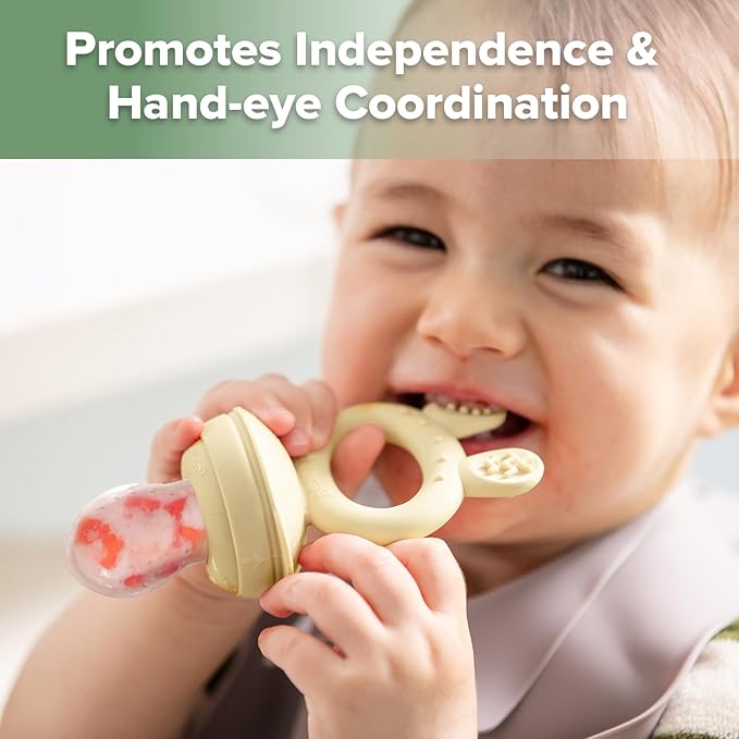 - 2-IN-1 FEEDING & TEETHING SOLUTION: Safely introduce new foods with this award-winning Haakaa baby fruit food feeder. Its soft silicone pouch allows only small, digestible pieces, ensuring safety from choking