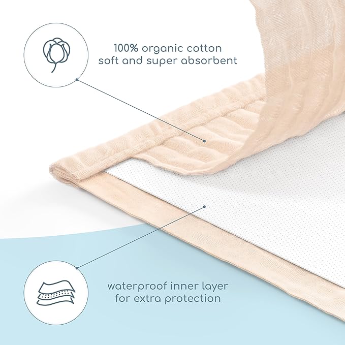 - 100% Natural Muslin Cotton top layer and waterproof inner layer - Our Muslin burp cloths are made of 100% organic cotton. It has a soft, pleasant structure of the fabric that easily absorbs moisture. It is breathable and skin-friendly with a lovely fluffy touch.