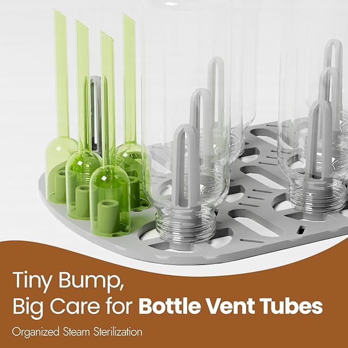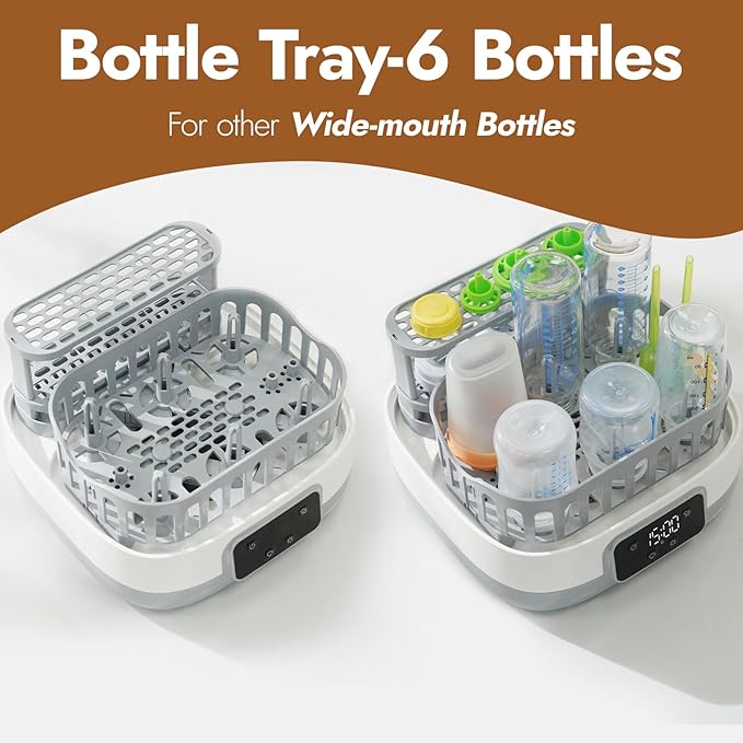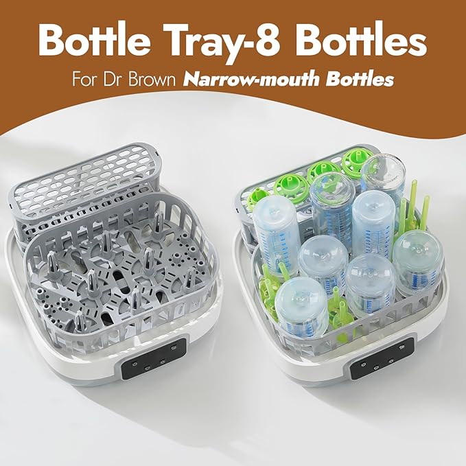 - 【Maximum Capacity & Versatility】Two freely replaceable bottle trays—one for up to 8 narrow-neck Dr. Brown 5/8oz bottles, and another for up to 6 wide-neck bottles from any brand, plus wearable pump parts and accessories. It’s the perfect solution for all your baby care needs