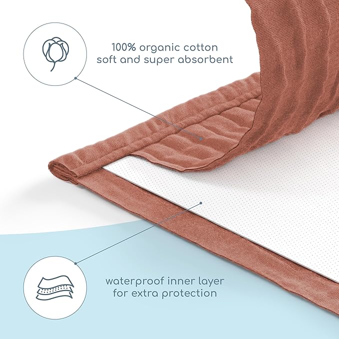 - 100% Natural Muslin Cotton top layer and waterproof inner layer - Our Muslin burp cloths are made of 100% organic cotton. It has a soft, pleasant structure of the fabric that easily absorbs moisture. It is breathable and skin-friendly with a lovely fluffy touch.