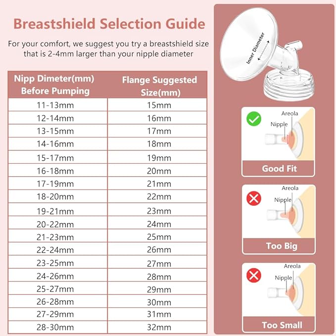 - 【Multiple Size Options】:Available in 18 different flange sizes: 15mm, 16mm, 17mm, 18mm, 19mm, 20mm, 21mm, 22mm, 23mm, 24mm, 25mm, 26mm, 27mm, 28mm, 29mm, 30mm, 31mm, 32mm. Choose the right size for pumping, don’t need extra flange insert to transfer ,more convenient and saving time, providing a more efficient and comfortable pumping experience