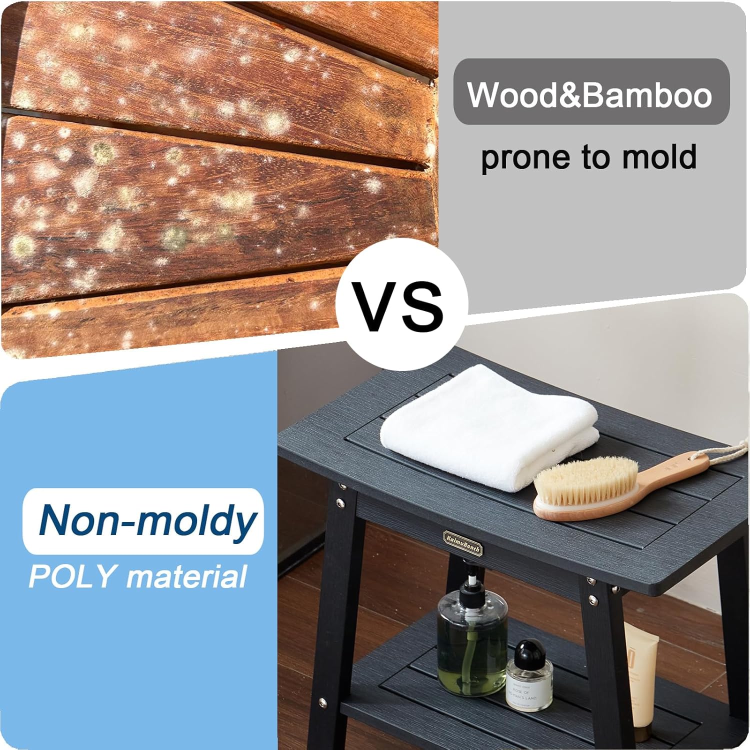 - 【Material & Size】Our shower bench is made of HDPS (polystyrene) with 304 stainless screws which never gets rust, this material is not easy to get m-o-l-d, rotting or crack after prolonged exposure to humidity, no splinters and no maintenance, 21 x 12.6 x 17.7 Inches enough large to sit (THE MOST IMPORTANT IS NO MAINTENANCE)