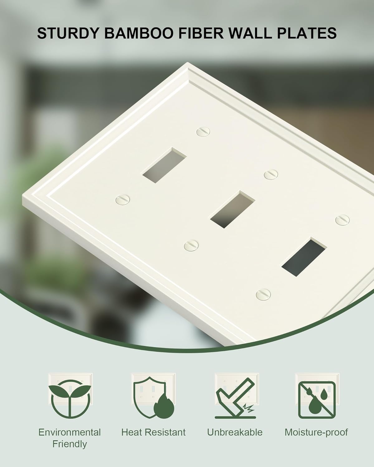 2-Pack Triple Toggle Light Switch Cover Plate, Light Almond Decorative Switch Plate Covers, Natural Bamboo Fiber 3 Gang Wall Plate, Corrosion Resistant