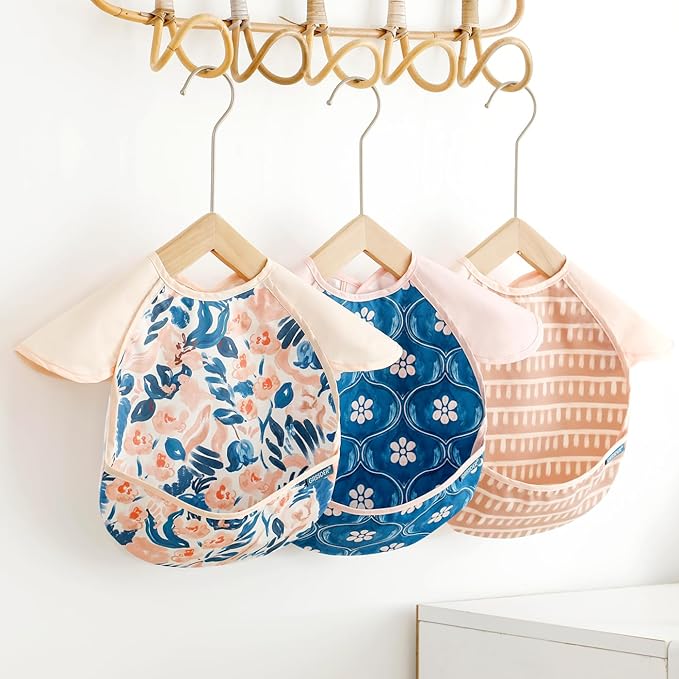 - ADORABLE AND FUNCTIONAL DESIGN: GRSSDER mess-proof bibs set include 3 different original adorable patterns, making your little ones more cuter and cheerful when feeding. Designed for comfort and convenience, our waterproof bibs keep your little one's clothes clean during mealtimes, playtimes and messy adventures. The deep catch-all pocket make it easy to grab every crumb, splash, and paint drip.