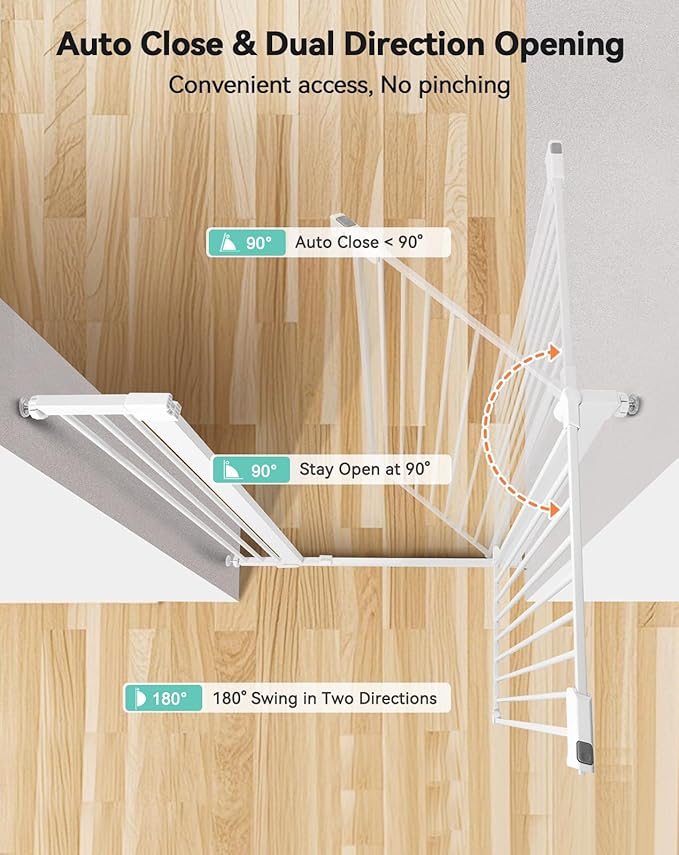 - Auto Close & Easy to install - The baby gate with door will be closed automatically due to gravity. The door can be swung in both directions, easy to operate the tall dog gate with one hand. Simple pressure-mounted installation requires no tools drilling, easy to put the tall pet gate together