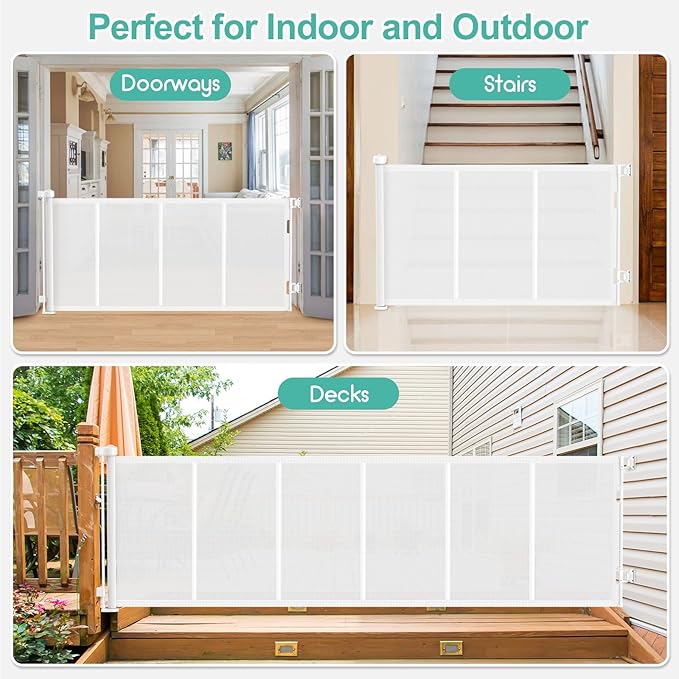 - Suitable for Indoor and Outdoor: Our retractable baby & dog gate can be installed on stairs, doorways, hallways, kitchens, decks, porches, garages, top and bottom of corridors, indoor and outdoor, and even extra-wide dog gates for the house. It's perfect for keeping children and pets safe, giving a large space for your little one to play, free mom’s hand. With this stair gate, you can have peace of mind knowing that your child or pet is always safety!
