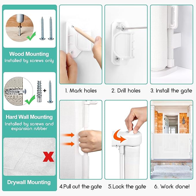 - Suitable for Indoor and Outdoor: Our retractable baby & dog gate can be installed on stairs, doorways, hallways, kitchens, decks, porches, garages, top and bottom of corridors, indoor and outdoor, and even extra-wide dog gates for the house. It's perfect for keeping children and pets safe, giving a large space for your little one to play, free mom’s hand. With this stair gate, you can have peace of mind knowing that your child or pet is always safety!