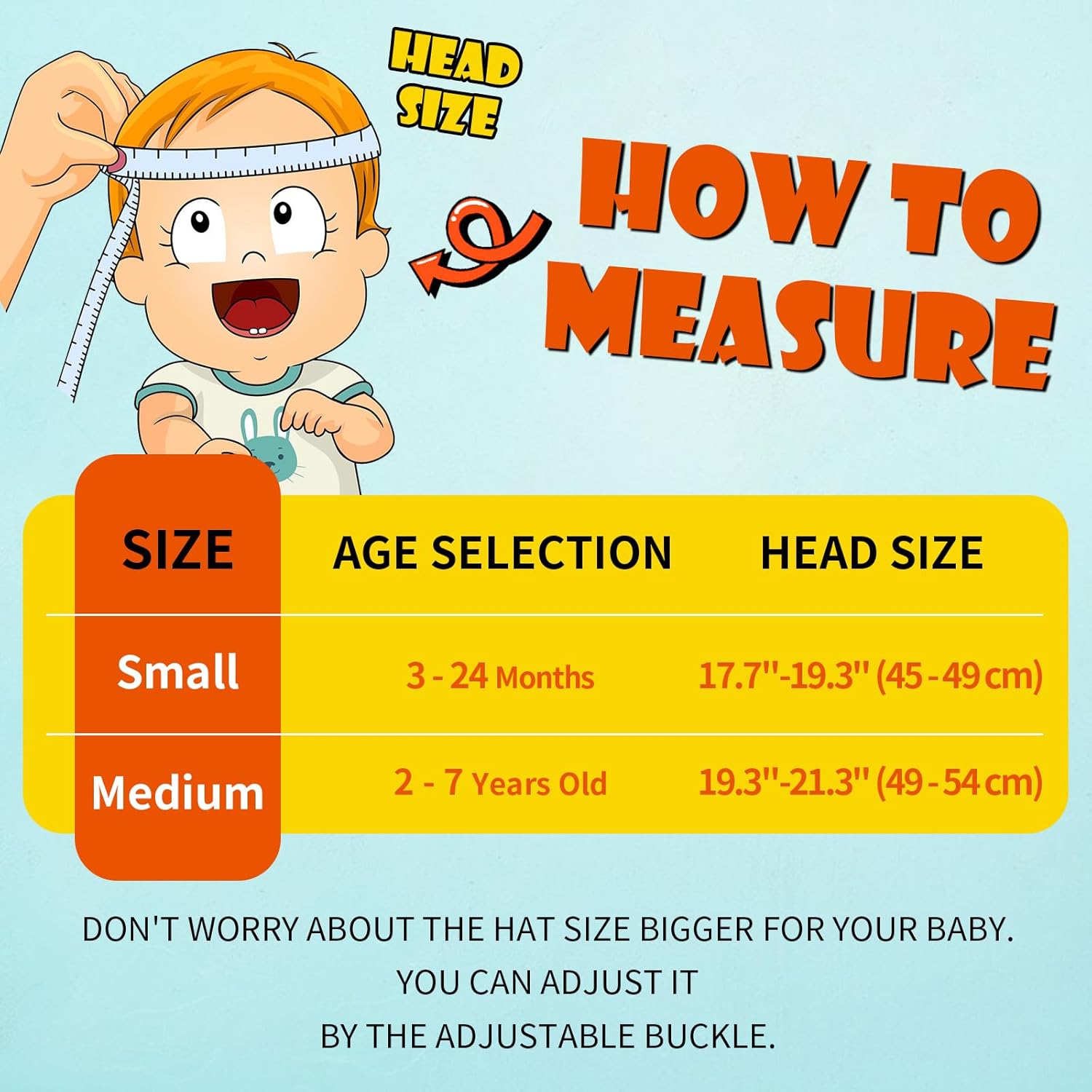 - ADJUSTABLE TO GROW WITH KIDS: Sun hat for kids has two sizes: Size S: 3-24 months fits head circumference 17.7"-19.3"; Size M: 2-7 years fits head circumference 19.3"-21.3". The stretchy headband and rope buckle behind the sunshade hat can adjust the head circumference for a comfort fit. Great for your toddler boy or toddler girl, and big kids too! So, this durable infant hat will definitely grow with your kids for a long time