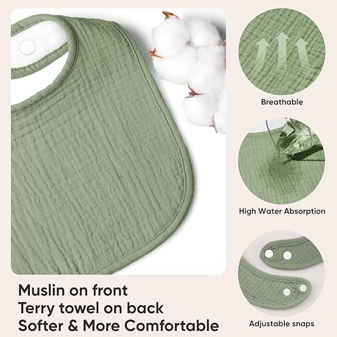 - 100% Cotton: Our Bearmoss muslin baby bibs are made with 100% cotton material that is soft and gentle for your baby's delicate skin. With muslin fabric, making them lightweight and breathable, also perfect for everyday wear.