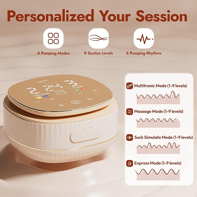 - Fully Customizable Pumping for Your Comfort: Featuring 4 modes (Massage, Simulation, and Multitronic, Expression) with 9 suction levels and 5 speed settings, this electric breast pump lets you personalize each session to match your flow and comfort. Great for moms with uneven milk production or sensitive breasts