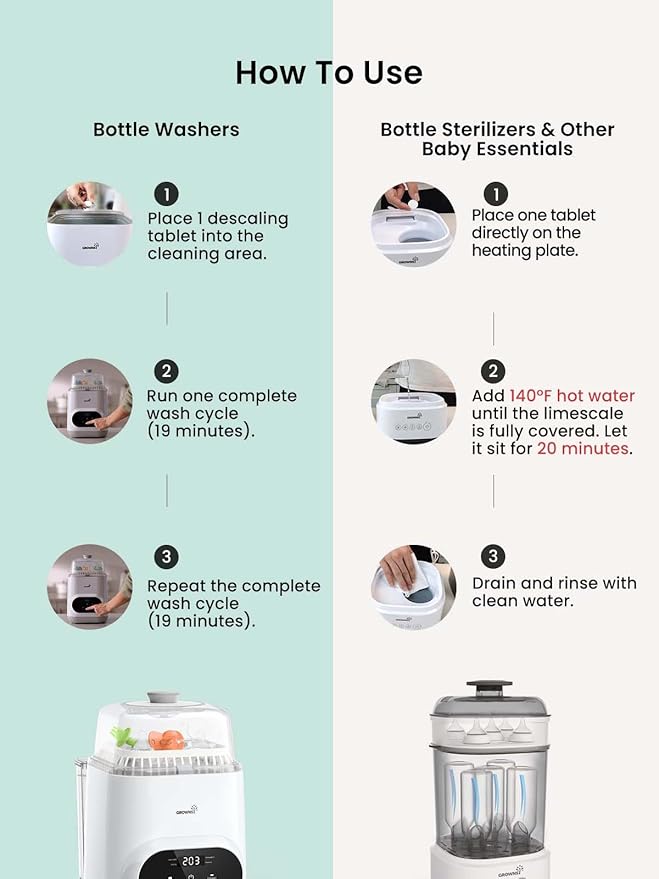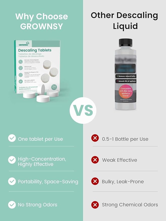 - ๐๐ง๐ข๐ฏ๐๐ซ๐ฌ๐๐ฅ ๐๐จ๐ฆ๐ฉ๐๐ญ๐ข๐๐ข๐ฅ๐ข๐ญ๐ฒ: GROWNSY descaling tablets compatible with all brands of baby bottle washers. Designed for use in bottle washers, sterilizers, warmers, formula makers, and other baby-feeding machines. One descaling solution for all your essential baby appliances.
