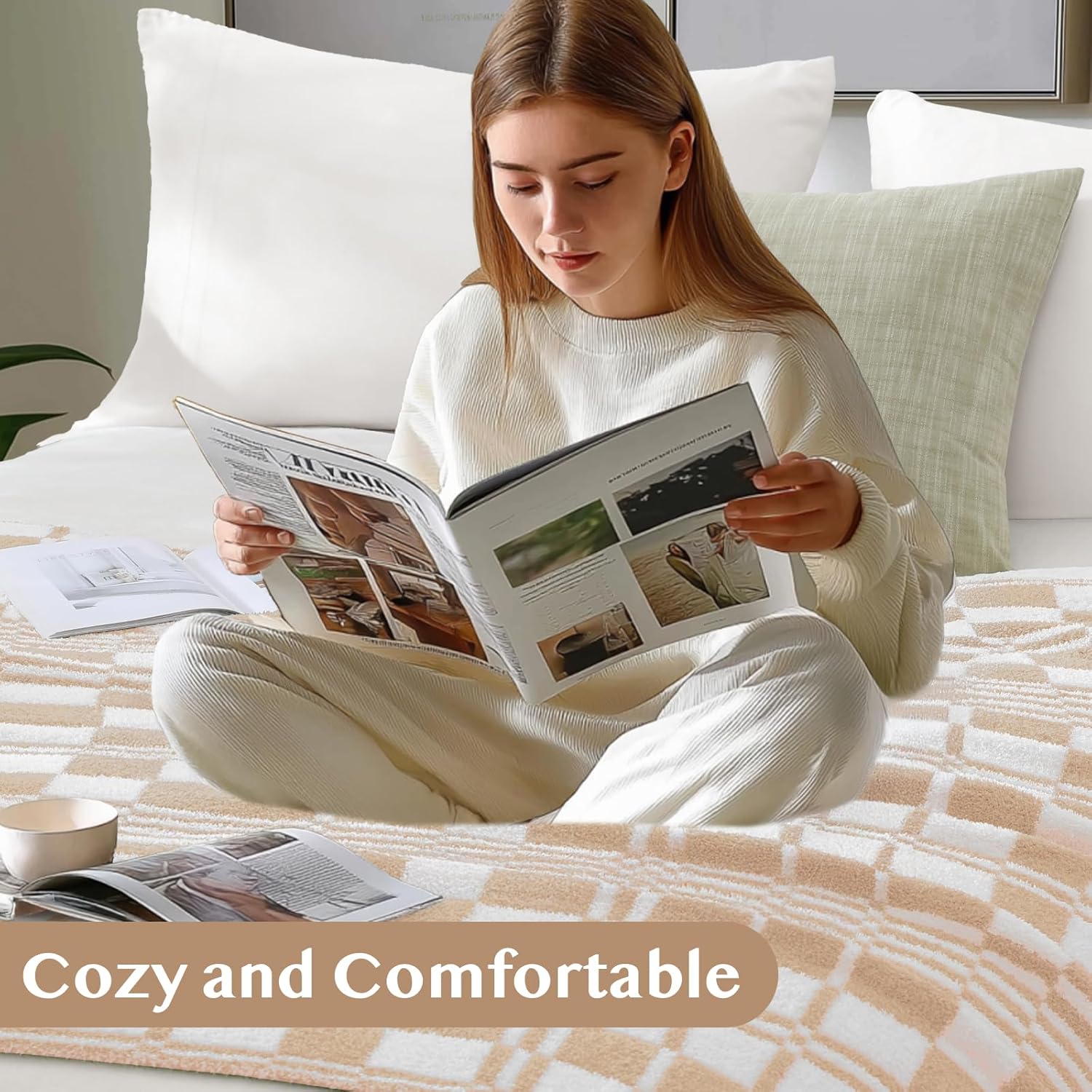 WRENSONGE Checkered Throw Blanket Toast Almond Soft Cozy Fluffy Warm Hand Made Weave Throw Blankets for Couch, Sofa, Chair, Bed, Camping, Picnic, Travel Lightweight Bed Blanket - 60"*80"