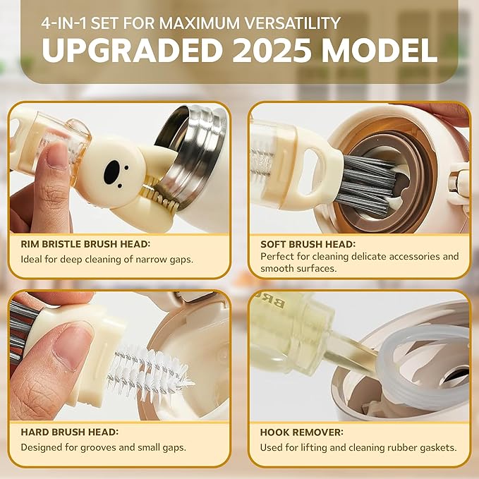 - 2025 MODEL FOR ULTIMATE CLEANLINESS: This new version features three different brush designs – rabbit, flower, and crocodile, offering flexible solutions for cleaning bottle lids, straws, and cup gaps. This 3 in 1 multifunctional cleaning brush serves as a water bottle cleaner brush, cup lid cleaner, and straw cleaner, ensuring a thorough and efficient cleaning experience. It’s also perfect as a lid cleaner or a bottle brush set with holder for easy storage.