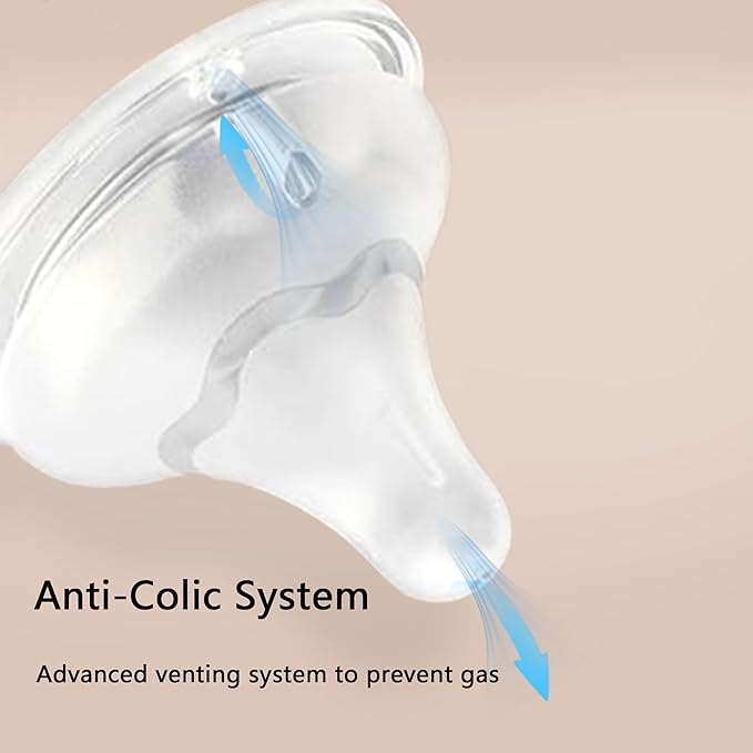 - Silicone Nipple: The nipple is made of food-grade silicone, which is super soft and allows the baby to suck naturally. There are air holes at the bottom of the nipple to balance the internal and external pressures, separate the milk from the air, and prevent the baby from inhaling too much air and causing colic and flatulence.