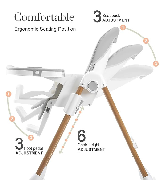 - GROWS WITH YOUR LITTLE ONE: From first feedings to toddler independence, this foldable high chair adapts to every stage. With 6 seat heights, 3 footrest positions, and 3 recline angles, it’s built to grow with your child. One-touch buttons make adjusting quick and hassle-free — comfort and function, all in one high chair