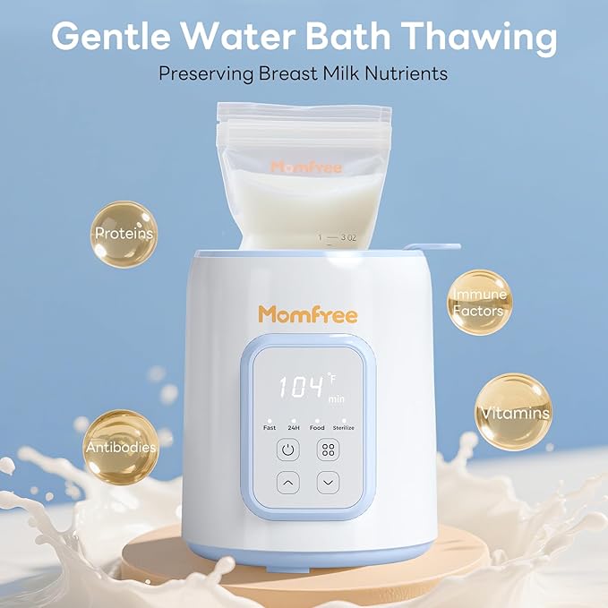 - 【8-in-1 Multi-function Bottle Warmer】Fast Warming/Thaw/Keep Warm/Steaming/Food Heating/Timer/Adjustable Temp/Lift-out Basket.Momfree bottle warmer fits most bottle types and materials and heats baby bottles, and baby food safely and evenly. It is suitable for feeding babies at different ages,from breast milk