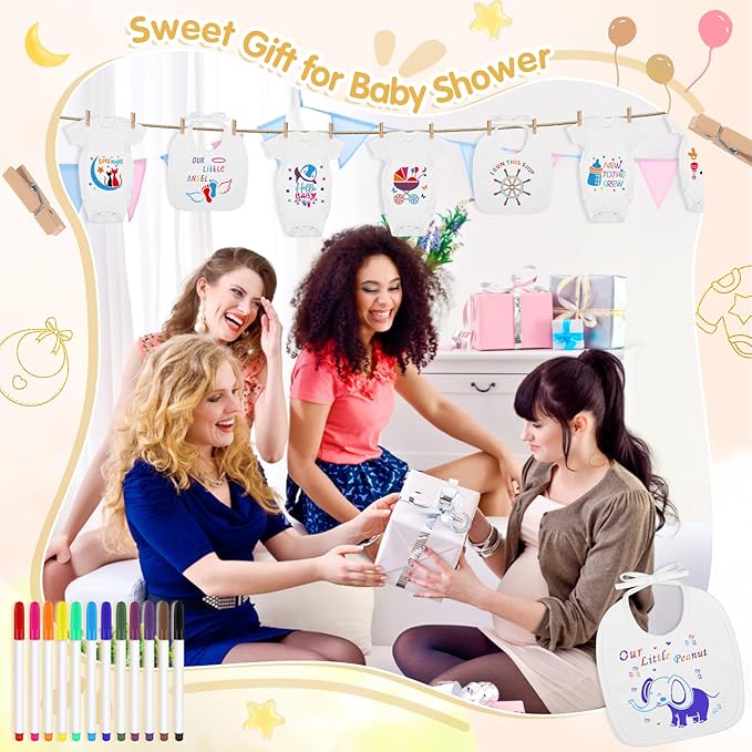 - Fabric markers are easy to color on bibs and bodysuits. Bibs and bodysuits are made of soft and breathable cotton fabric to ensure baby's comfort. The reusable PET stencils, smooth wood clips, and sturdy kraft tags help ensure a premium experience for baby shower games and decoration setups