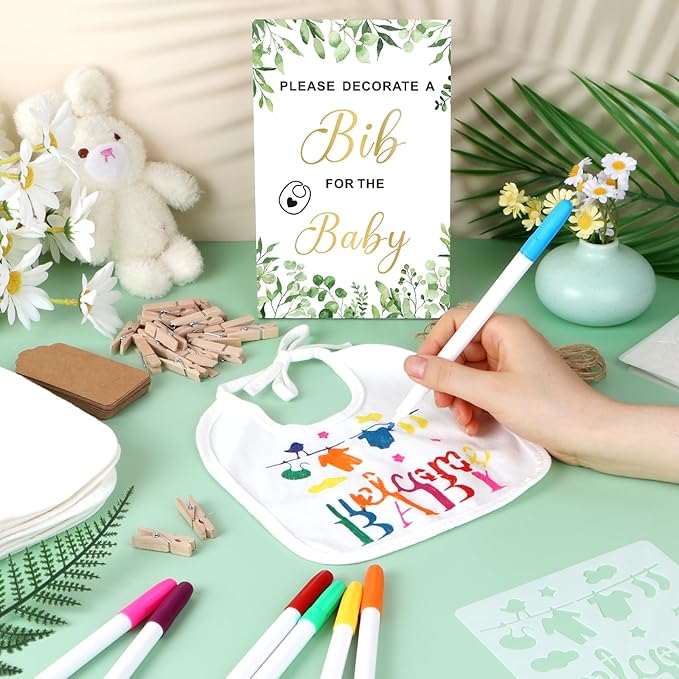 - Creative & Fun Mess-Free Activity: Transform your celebration into an engaging baby shower games experience. Guests can use the reusable stencils and bright, non-toxic markers to decorate the blank bibs with custom messages and adorable patterns, making this a relaxing and creative DIY event. This fun activity doubles as a fantastic display for your baby shower decorations, showcasing your guests' artistic talents and well wishes for the new arrival