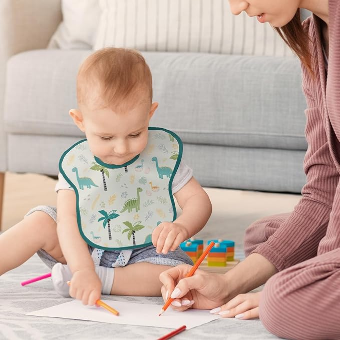 - Waterproof and Spill-Proof:Crafted from 100% polyester (softer than silicone!), these infant blue dinosaur baby feeding bibs feature a waterproof design keep your baby clean and dry during self-feeding sessions.