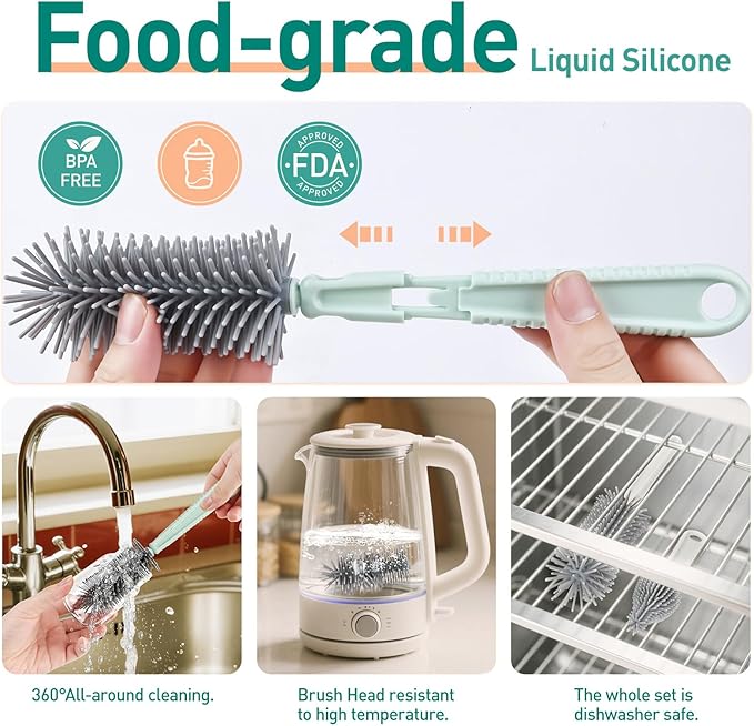 - Upgraded Silicone Bristles: 360° flexible silicone bristles clean better than sponge or nylon brushes - ideal for narrow-neck bottles and hard-to-reach containers.