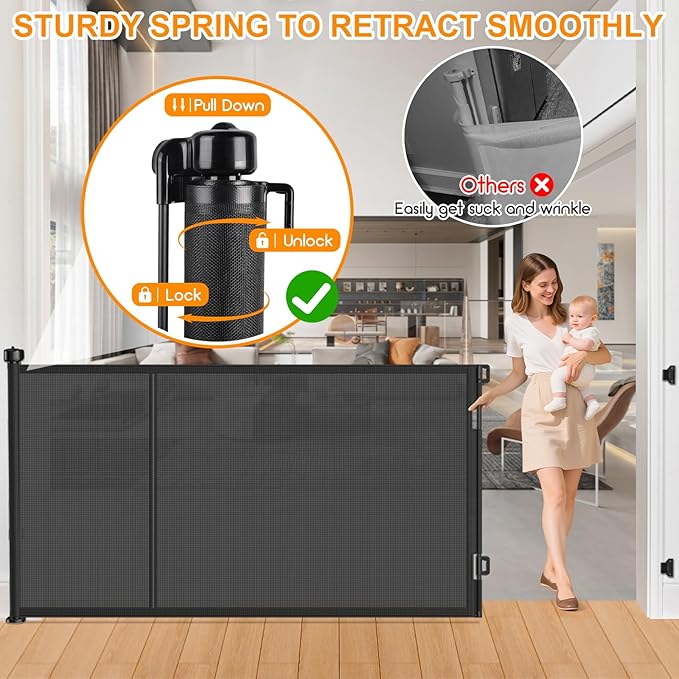- Reinforced Strip Design: Our large retractable baby gate features upgraded fiberglass reinforcement rods with smooth, rounded ends, reducing the risk of damage to the mesh structure and brings an extremely smooth retracting experience. The sturdy and non-deformable design effectively reduces top sagging and bottom lifting, preventing babies and dogs from crawling under the mesh gate, keeping them away from dangers.
