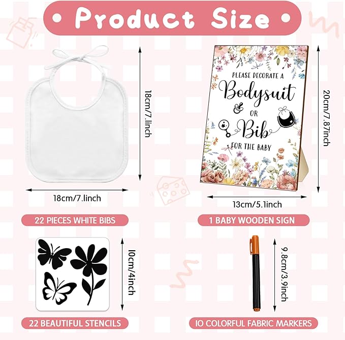 - Package List: you will get 22 pieces of white baby bibs, 22 pieces of stencils, 10 pieces of fabric markers and 1 wooden baby shower game sign, such a complete combination to meet your needs for DIY baby gifts or gift giving