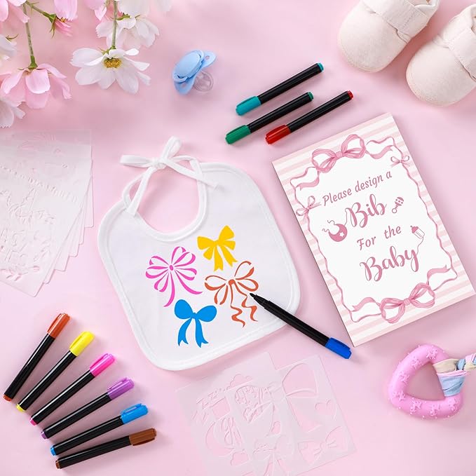 - Package List: you will get 22 pieces of white baby bibs, 22 pieces of stencils, 10 pieces of fabric markers and 1 wooden baby shower game sign, such a complete combination to meet your needs for DIY baby gifts or gift giving