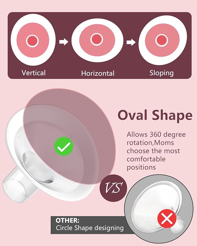 - 【Oval Shape, 105°opening angle 】:Different from ordinary round-shape flange, our flex flange is oval-shape, allowing 360 degree rotations,allowing you to pump comfortably in a variety of positions. An improved 105°wide-angle hole on the flex shield, nipples are closer to the tunnel for proper seal, and reduce the pressure&pain during breast-pumping for moms.