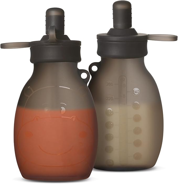 haakaa Hippo Wide Opening Silicone Goody Pouch β Reusable Pouches for Toddlers, Reusable Baby Food Pouches with Wide Neck for Quick Filling & Cleaning, 9oz, 2 Pack, (Grey)