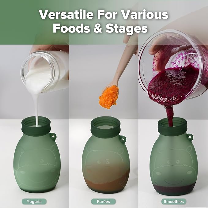 haakaa Hippo Wide Opening Silicone Goody Pouch β Reusable Pouches for Toddlers, Baby Food Pouches with Wide Opening for Easy Fill & Clean, Perfect for Purees & Smoothies, 9oz, 2 Pack, (Pea Green)