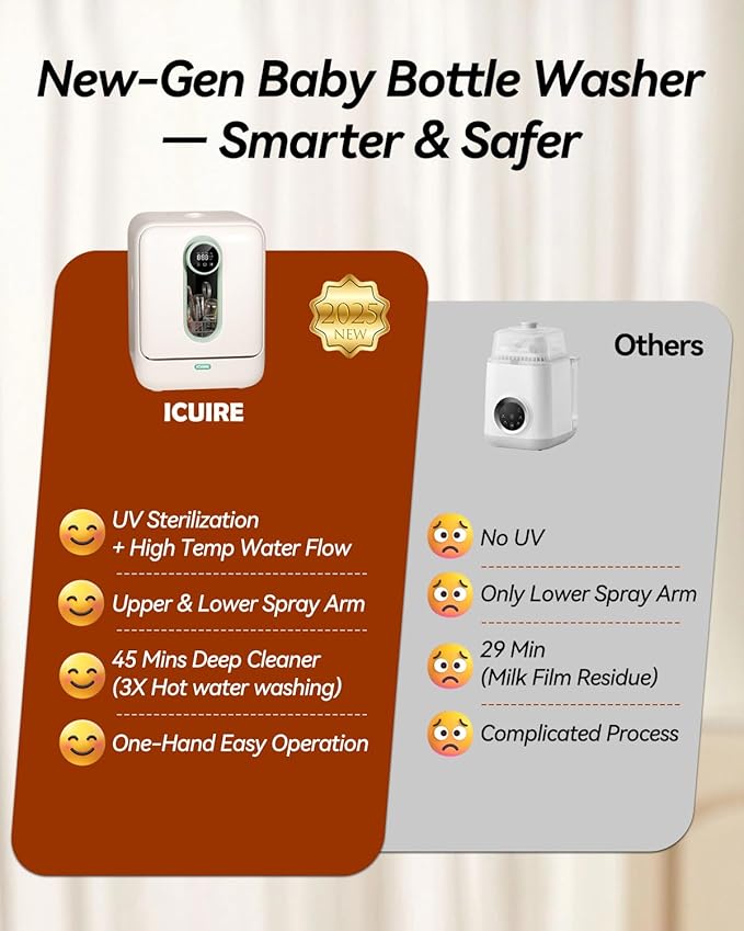 ICUIRE Baby Bottle Washer and Sterilizer and Dryer, 131-167°F High Temperature Sterilize for Baby Stuff, 3.2L Water Tank to Clean Bottles, Pump Part &Pacifiers&Bowl, Newborn Parents One-Hand Operation