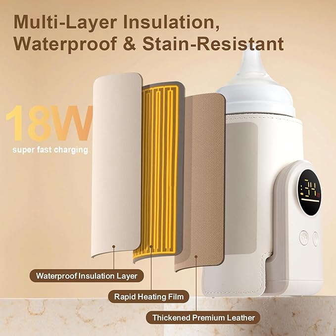 18W Portable Baby Bottle Warmer for Travel – Fast, Waterless Milk Heater for Breastmilk & Formula | USB Rechargeable Bottle Warmer with Precise Temperature Control – Essential for On-The-Go Feeding