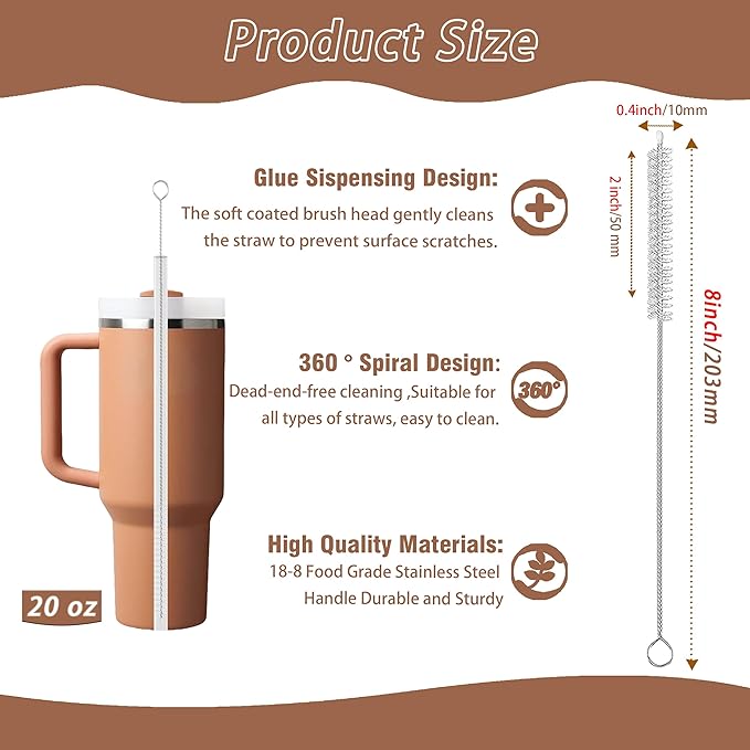 - 【Package Contents】This straw cleaner brush set includes 3-pack 8-inch tools with 2-inch bristles (0.4-inch diameter), ideal for deep reusable straws and narrow tubes. The straw brush set contains specialized heads for tumblers, Stanley cup straw cleaner adapters, and silicone straw maintenance. Organized in a travel case with straw cleaner brush slots, straw brushes for cleaning straws.Metal straw cleaner brush for Baby Bottles.