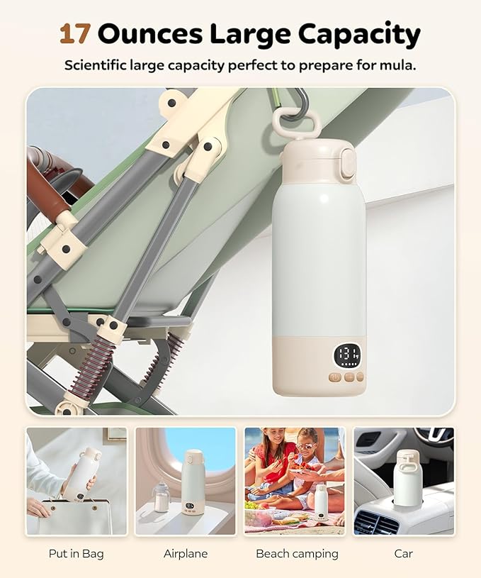 Portable Bottle Warmer for Travel, Milk Warmer for Breast Milk Formula & Water with Fast Heating & Smart Temperature Control,17oz Large Capacity