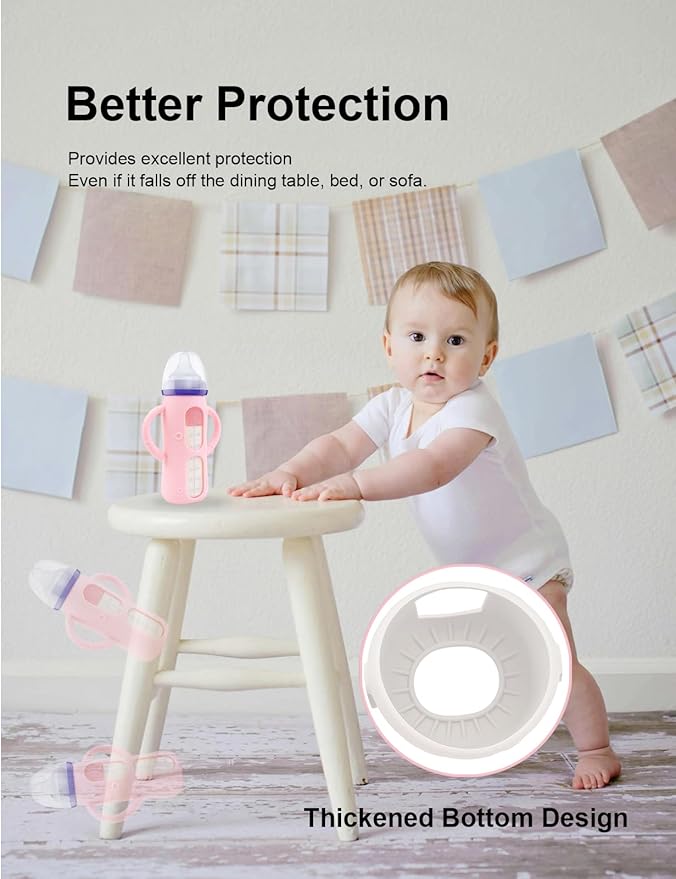 - Easy-Grip Handles for Little Hands – Ergonomically designed handles are perfectly sized for tiny hands, helping your baby hold their glass bottle securely and reducing the risk of drops. Even if it slips from the dining table, bed, or sofa, it provides superior protection—while encouraging your baby to master self-feeding faster.