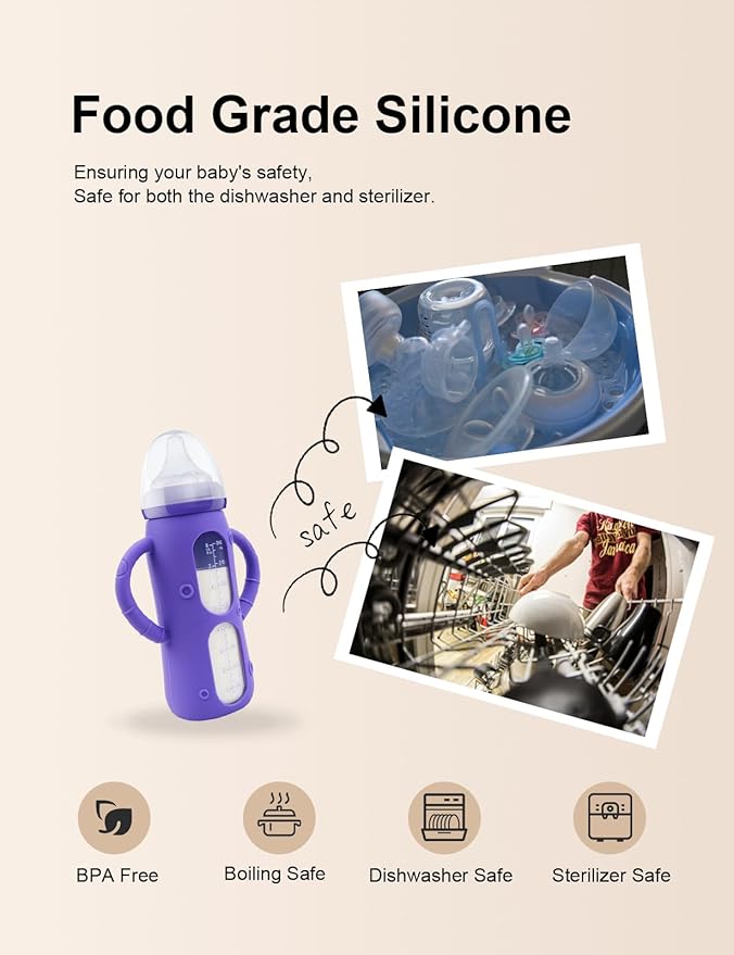 - Food-Grade Silicone for Baby’s Safety – Made from premium, BPA-free silicone with absolutely no harmful chemicals, this glass bottle sleeve keeps your baby safe and protected. It’s dishwasher- and sterilizer-safe, making cleanup quick and effortless—so you can focus on enjoying those precious moments with your little one.