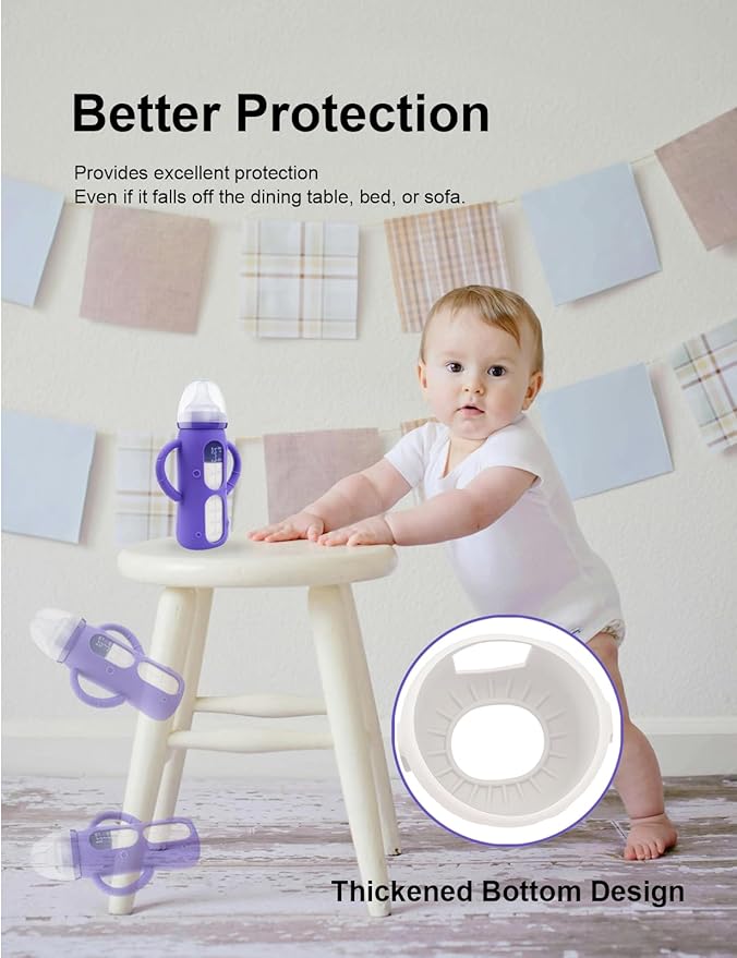 - Easy-Grip Handles for Little Hands – Ergonomically designed handles are perfectly sized for tiny hands, helping your baby hold their glass bottle securely and reducing the risk of drops. Even if it slips from the dining table, bed, or sofa, it provides superior protection—while encouraging your baby to master self-feeding faster.