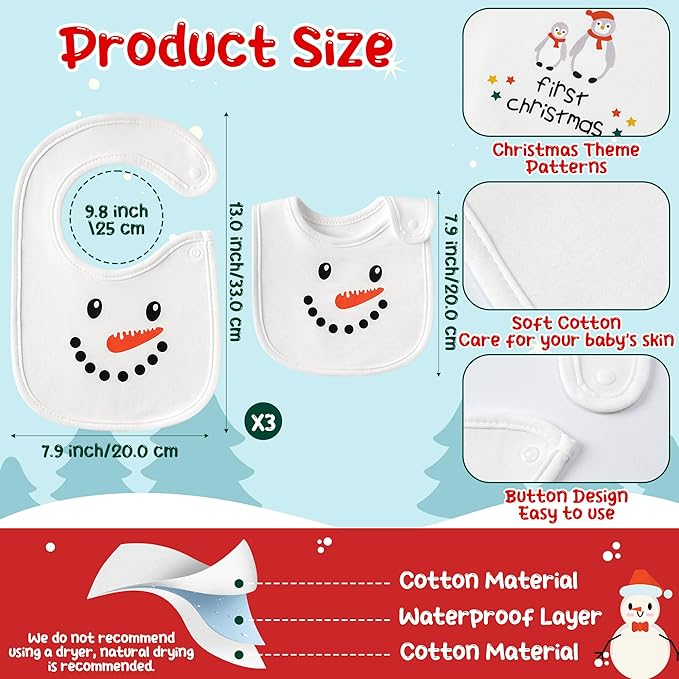 - Christmas Theme Baby Bibs Set: Our adorable Christmas theme baby bibs feature charming penguin and snowman prints in a cheerful white base color. These Christmas baby bibs also come with resin snap buttons for a comfortable fit suitable for infants 6-12 months old, keeping little ones neat and adding delightful Christmas touches to their outfits.