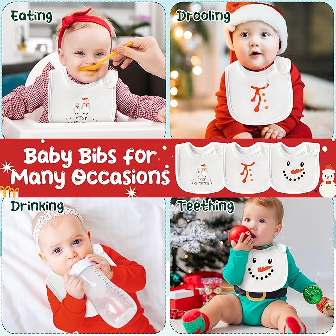 - Wonderful Christmas Gift: Ideal as a gift for baby's first Christmas, our infant bibs help little ones discover the joy of the holidays. They also make a thoughtful gift for new parents, simplifying childcare and reducing laundry worries. Plus, these adorable Christmas themed baby bibs serve as both a delightful surprise and a fantastic prop for festive photos.