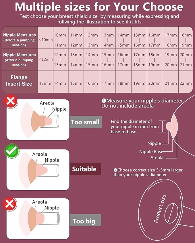 - 【Match Correct Size,Customized Comfort】: These breast pump flange insert kits are designed for most 24mm wearable pumps. We have developed 13/14/15/16/17/18/19/20/21/22mm flange inserts size to meet for most mothers during different stages of breastfeeding. If your nipple rubs or feels squeezed in the flange channel, it is an unsuitable flange size and you need to replace the right size flange insert.