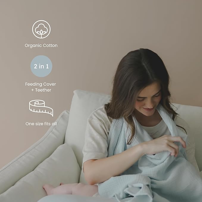 - MULTIFUNCTIONAL: Use the feeding cover for breastfeeding or as a burp cloth, comforter, or a quick cover-up. The feeding tie doubles as a teething ring for your little one and is made from BPA-free, chemical-free silicone.