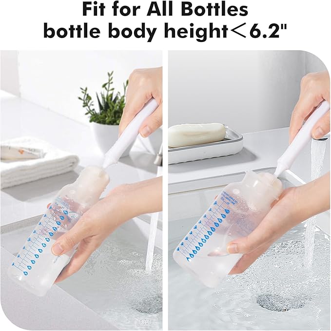 - Baby Bottle Cleaning - 11.4" silicone cleaning brush, opening design in the middle, fit for bottle collar or bottle mouth. 6.8" Sponge Brush fit for wide neck baby bottles cleaning and bottle height is less than 6 inches, and also fit for narrow neck baby bottles cleaning and bottle height is less than 5 inches