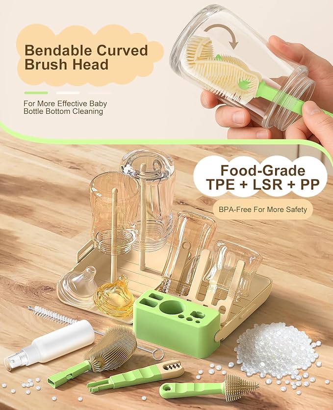 - BPA-Free Safe Material for Baby’s Protection: Our upgraded bottle cleaning kit uses food-grade material, free of BPA and other harmful substances. Brush heads are boilable for disinfection. Soft yet durable, it effectively removes milk stains and dirt without scratching bottle interiors—suitable for glass, plastic, PP, and other bottle materials.